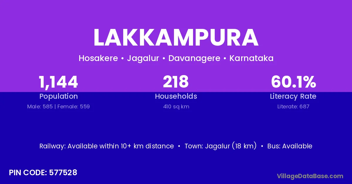 Jagalur (18 km) is the nearest town to Lakkampura village for major economic activities and is located approximately 18 km away.