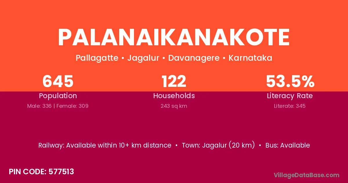 Jagalur (20 km) is the nearest town to Palanaikanakote village for major economic activities and is located approximately 20 km away.