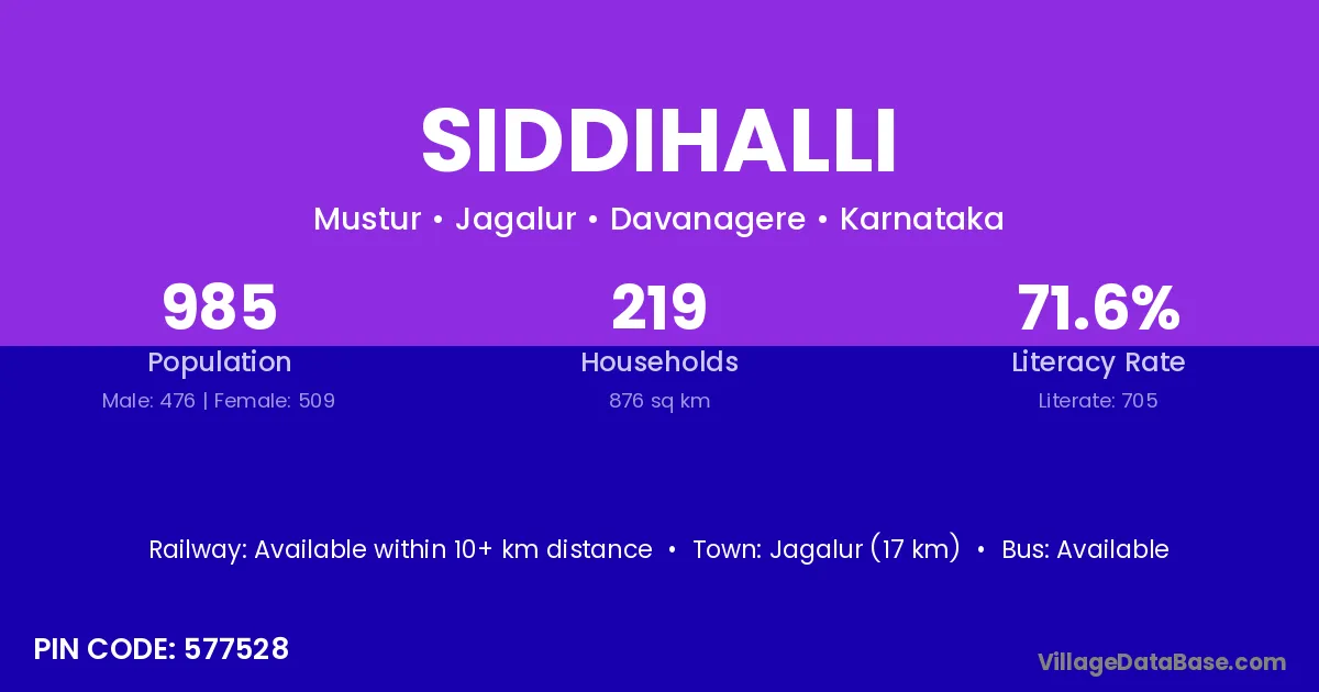 Jagalur (17 km) is the nearest town to Siddihalli village for major economic activities and is located approximately 17 km away.