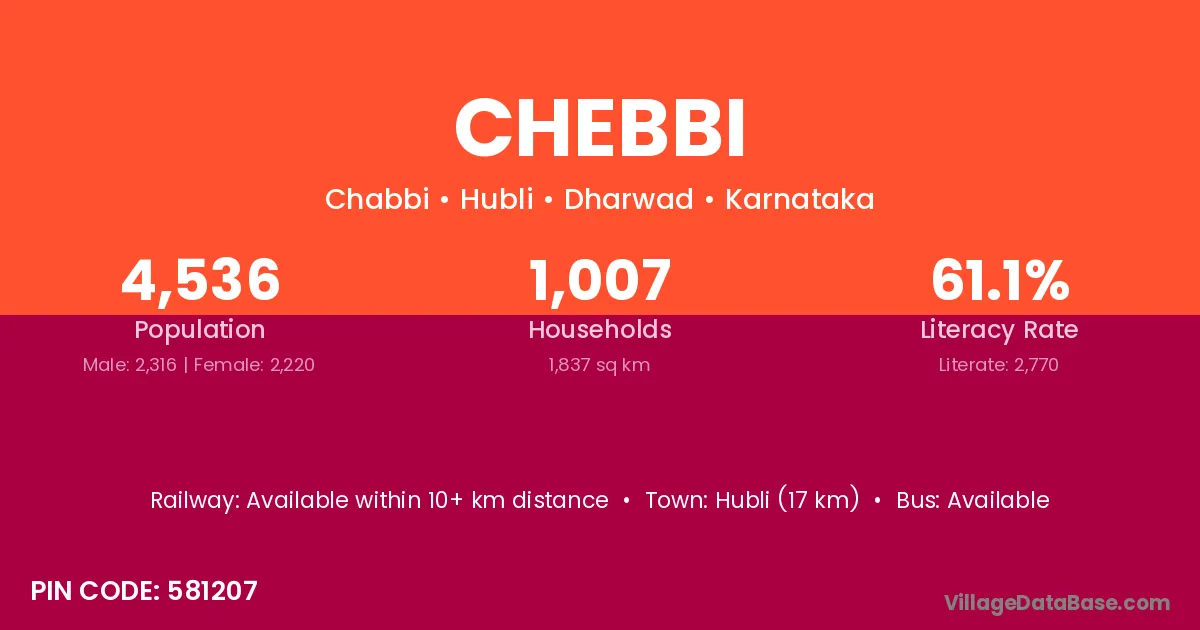 Hubli (17 km) is the nearest town to Chebbi village for major economic activities and is located approximately 17 km away.