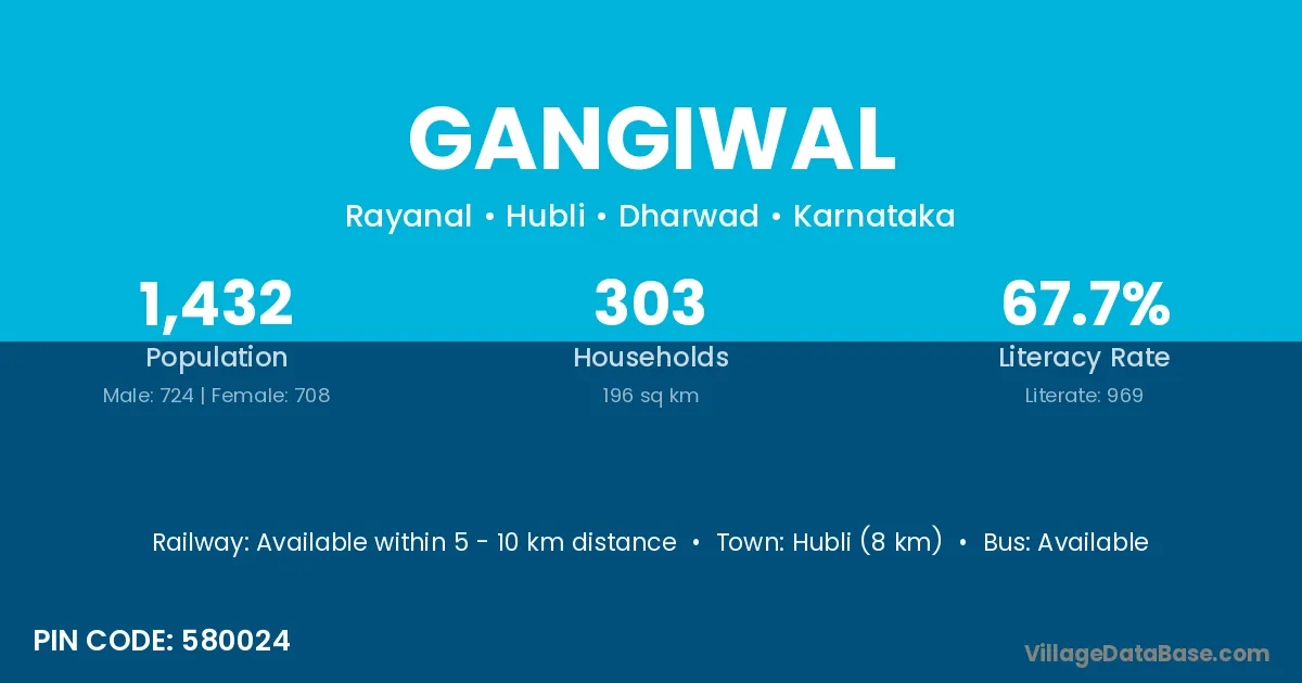 Hubli (8 km) is the nearest town to Gangiwal village for major economic activities and is located approximately 8 km away.