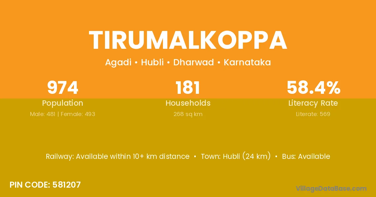 Tirumalkoppa village has a total population of 974 people, of which 481 are males and 493 are females.