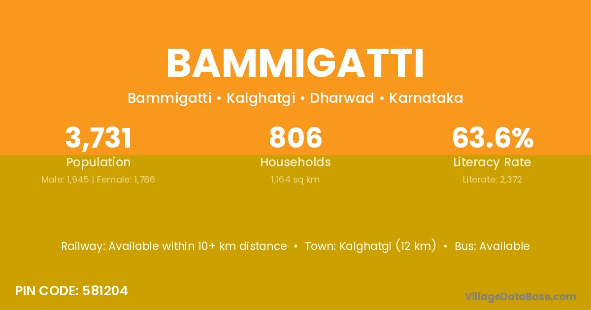 Kalghatgi (12 km) is the nearest town to Bammigatti village for major economic activities and is located approximately 12 km away.