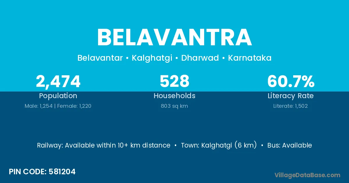 Kalghatgi (6 km) is the nearest town to Belavantra village for major economic activities and is located approximately 6 km away.