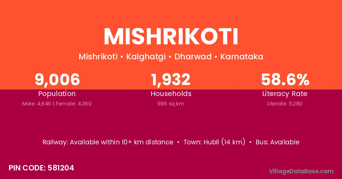 Hubli (14 km) is the nearest town to Mishrikoti village for major economic activities and is located approximately 14 km away.