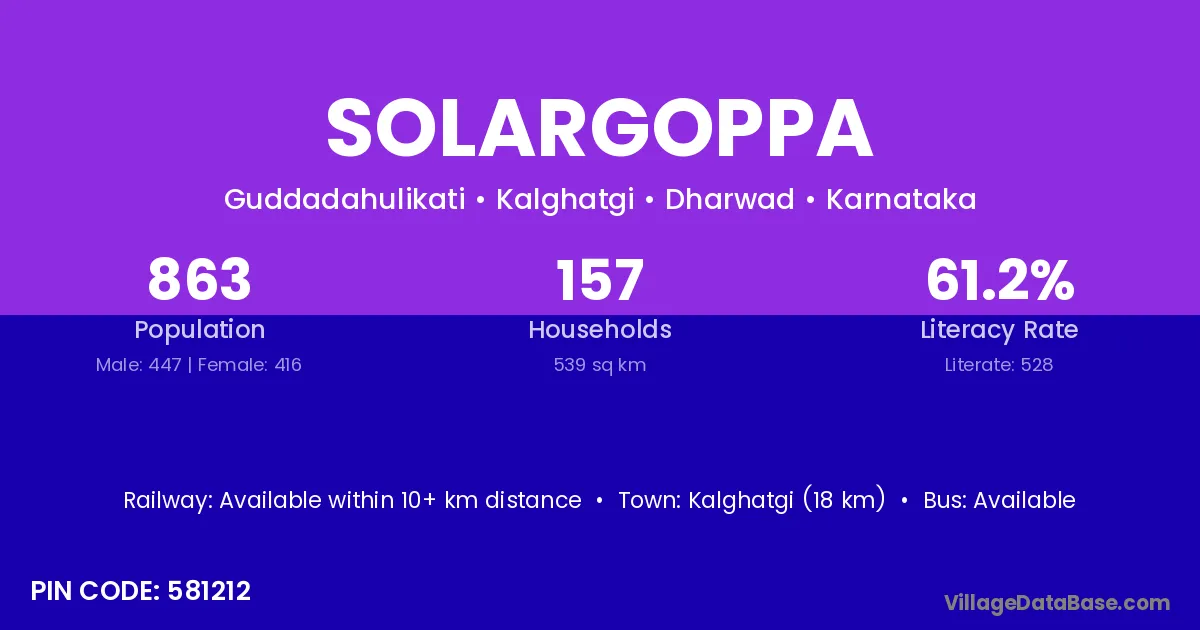 Kalghatgi (18 km) is the nearest town to Solargoppa village for major economic activities and is located approximately 18 km away.