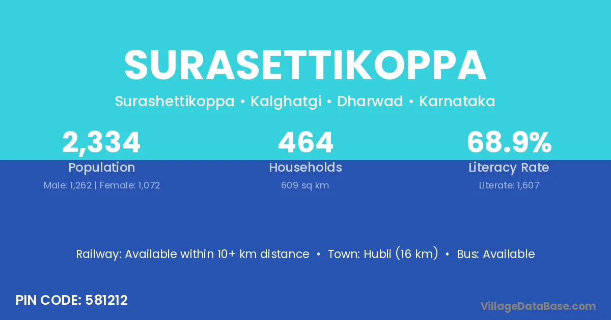 Hubli (16 km) is the nearest town to Surasettikoppa village for major economic activities and is located approximately 16 km away.