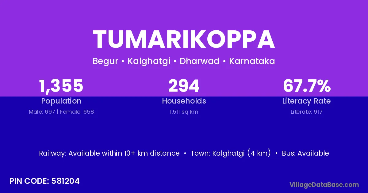 Kalghatgi (4 km) is the nearest town to Tumarikoppa village for major economic activities and is located approximately 4 km away.