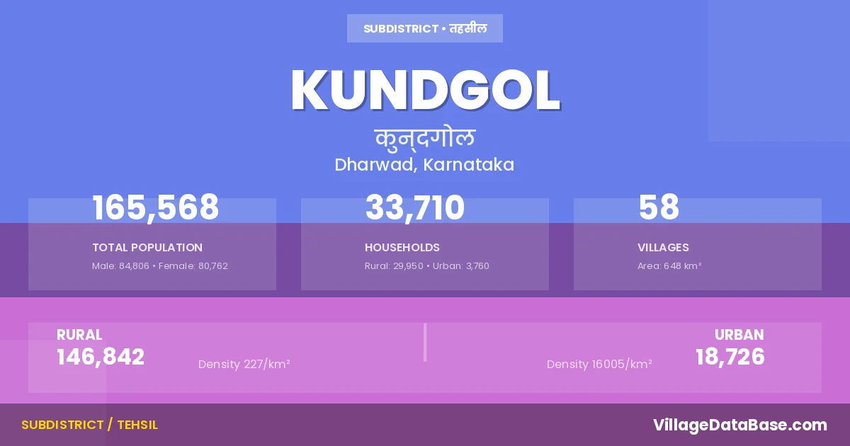 According to the 2011 census The total area of Kundgol Taluka is 648 km², with a population of 165568 people. The population density is 256 inhabitants per square kilometre, and there are approximately 33710 houses in the sub district.