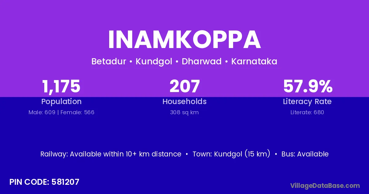 Kundgol (15 km) is the nearest town to Inamkoppa village for major economic activities and is located approximately 15 km away.