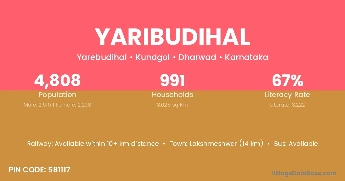 Lakshmeshwar (14 km) is the nearest town to Yaribudihal village for major economic activities and is located approximately 14 km away.