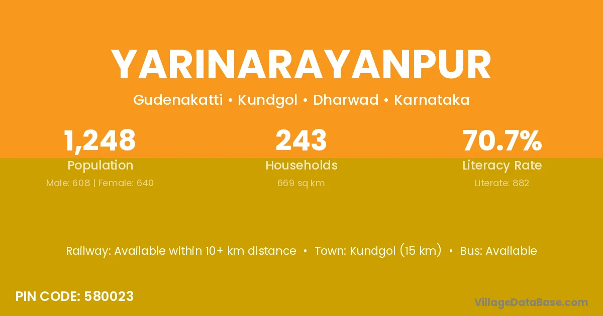 Kundgol (15 km) is the nearest town to Yarinarayanpur village for major economic activities and is located approximately 15 km away.
