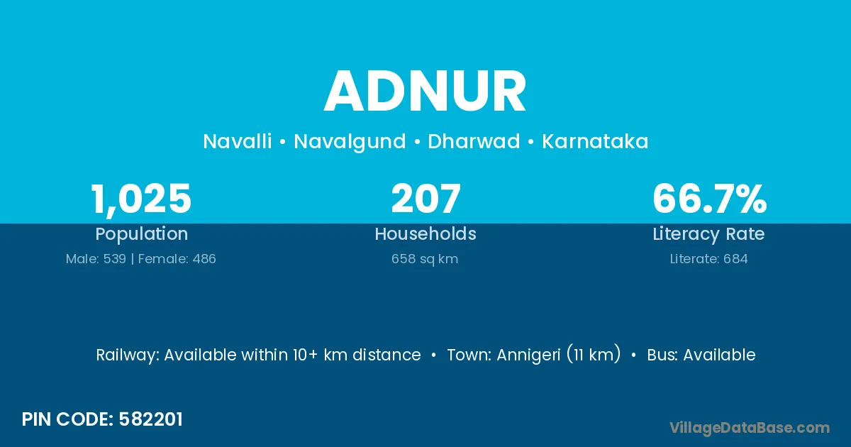 Annigeri (11 km) is the nearest town to Adnur village for major economic activities and is located approximately 11 km away.