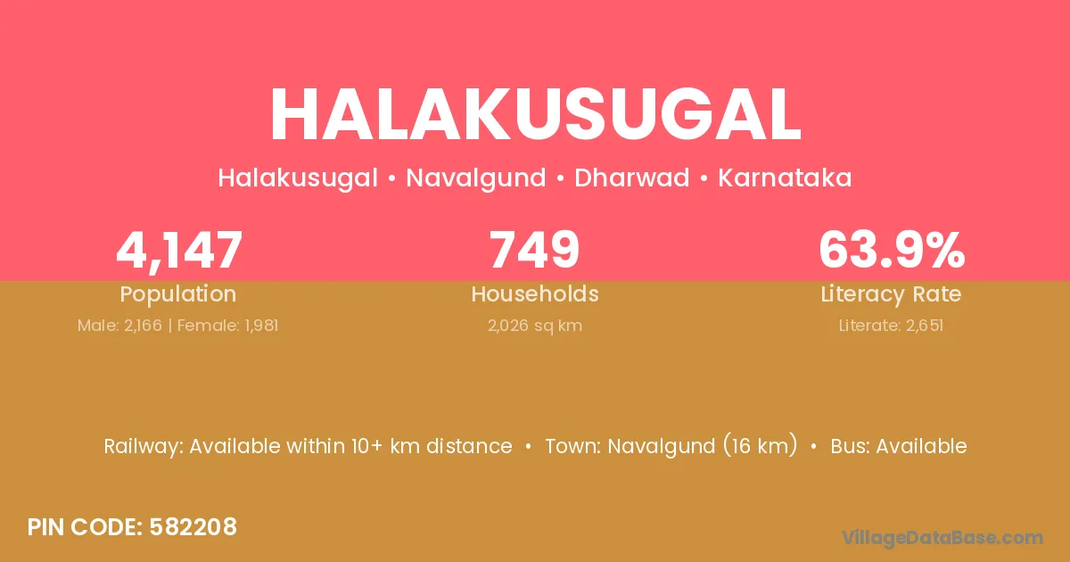 Navalgund (16 km) is the nearest town to Halakusugal village for major economic activities and is located approximately 16 km away.