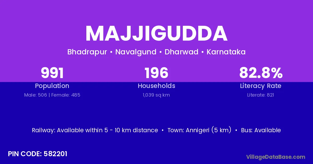 Annigeri (5 km) is the nearest town to Majjigudda village for major economic activities and is located approximately 5 km away.