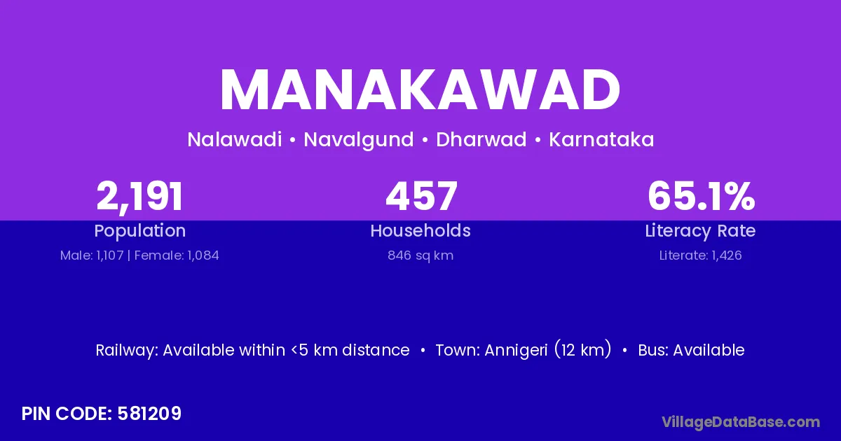 Annigeri (12 km) is the nearest town to Manakawad village for major economic activities and is located approximately 12 km away.