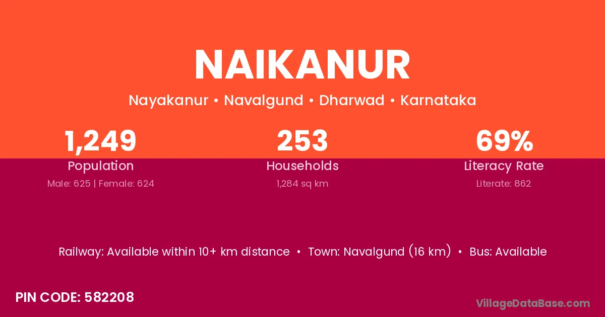 Navalgund (16 km) is the nearest town to Naikanur village for major economic activities and is located approximately 16 km away.