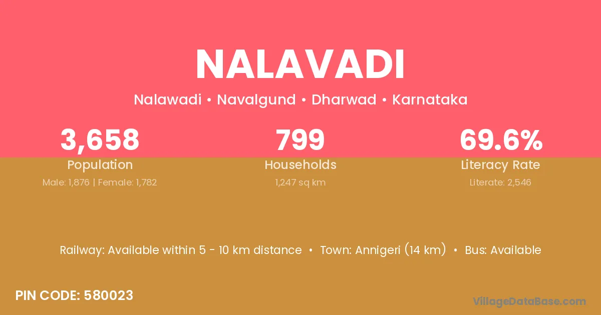Annigeri (14 km) is the nearest town to Nalavadi village for major economic activities and is located approximately 14 km away.