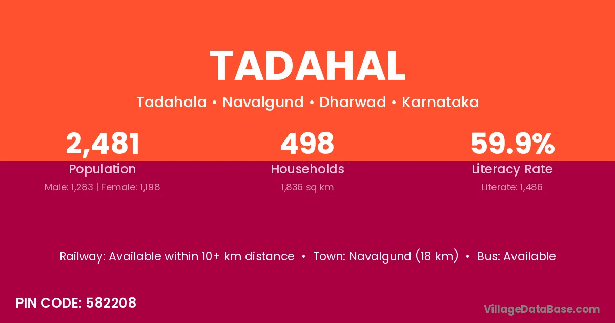 Navalgund (18 km) is the nearest town to Tadahal village for major economic activities and is located approximately 18 km away.