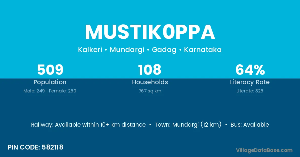 Mundargi (12 km) is the nearest town to Mustik0ppa village for major economic activities and is located approximately 12 km away.