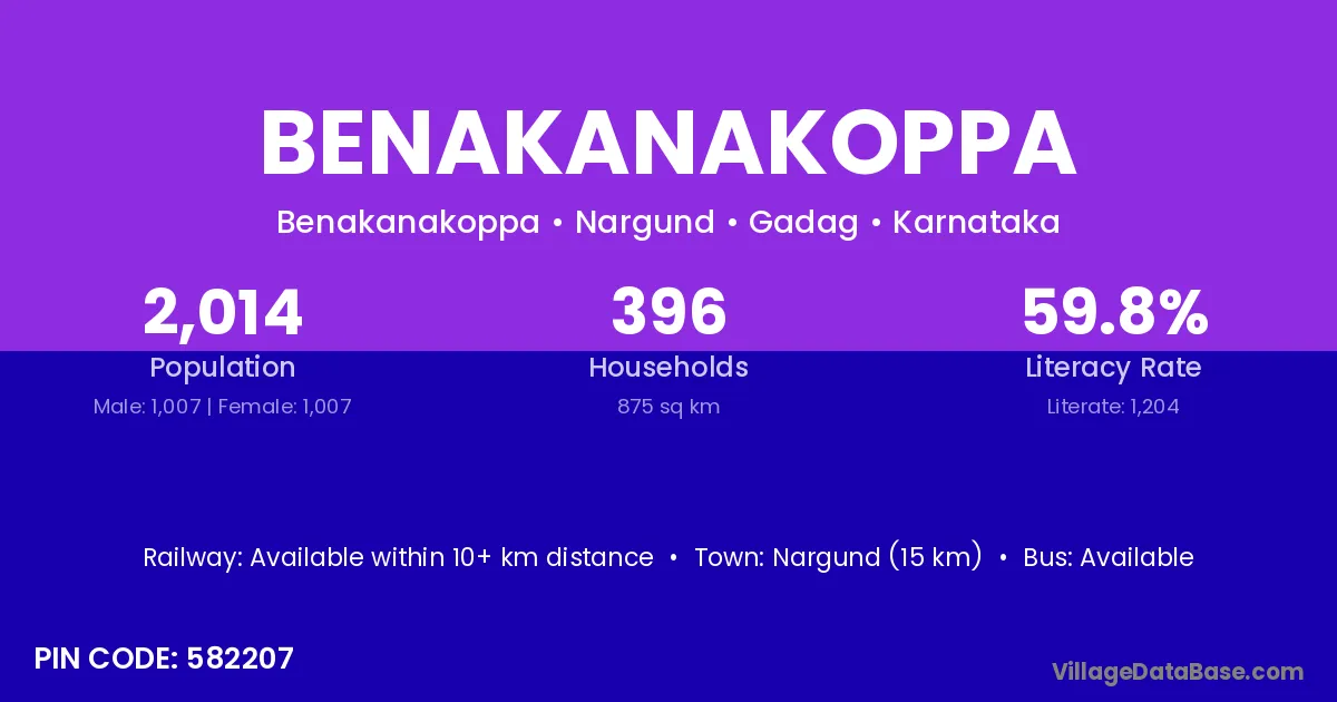 Benakanakoppa village has a total population of 2,014 people, of which 1,007 are males and 1,007 are females.