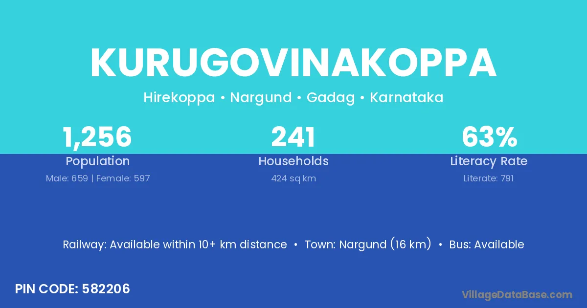 Nargund (16 km) is the nearest town to Kurugovinakoppa village for major economic activities and is located approximately 16 km away.