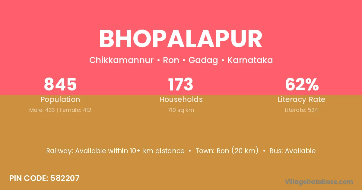 Ron (20 km) is the nearest town to Bhopalapur village for major economic activities and is located approximately 20 km away.