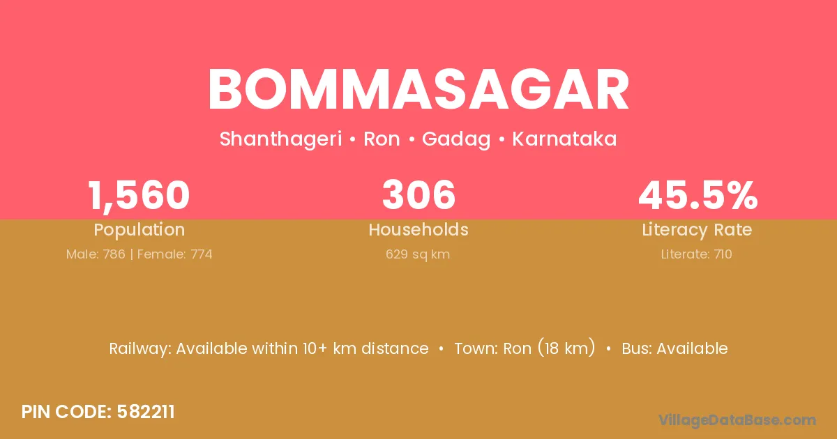 Ron (18 km) is the nearest town to Bommasagar village for major economic activities and is located approximately 18 km away.