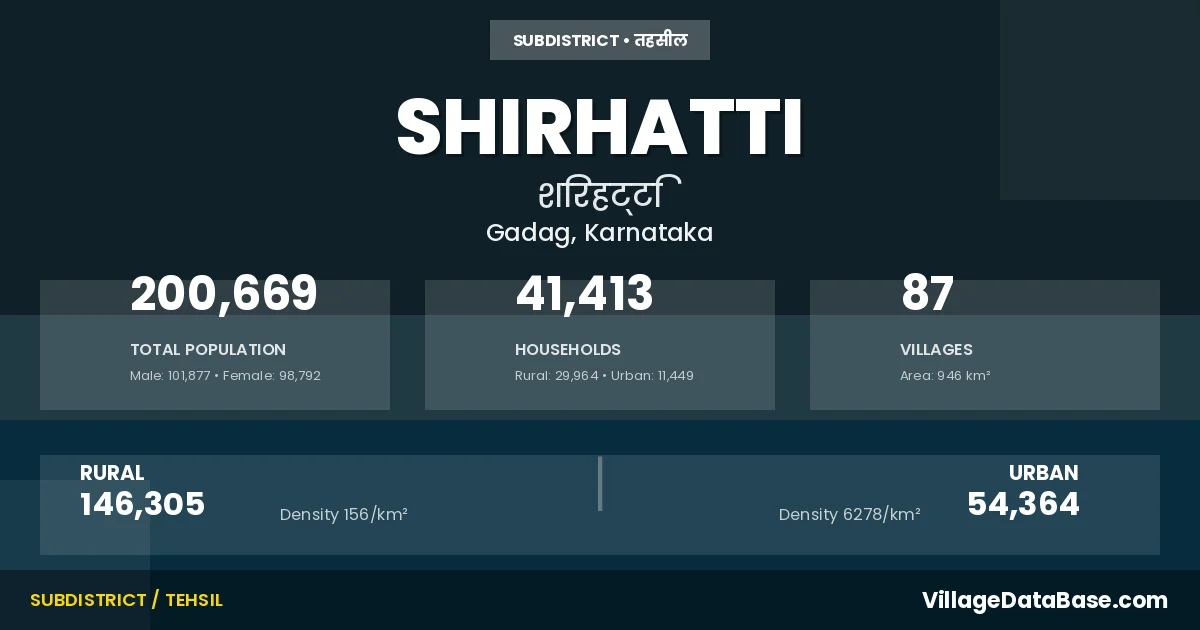 According to the 2011 census The total area of Shirhatti Taluka is 946 km², with a population of 200669 people. The population density is 212 inhabitants per square kilometre, and there are approximately 41413 houses in the sub district.