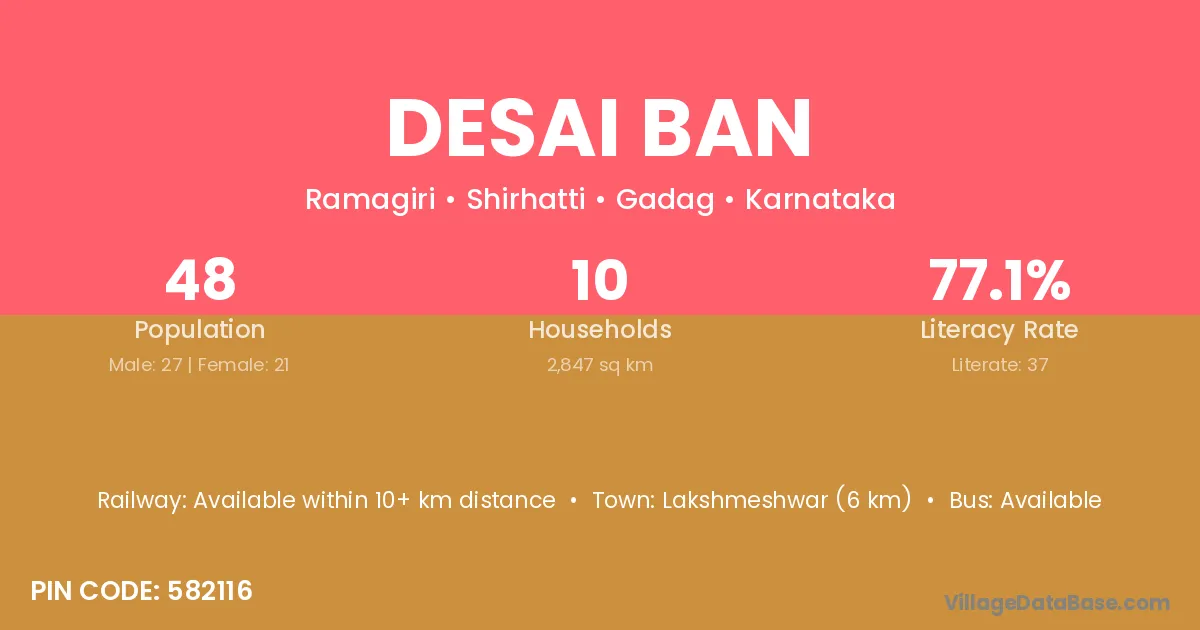 Lakshmeshwar (6 km) is the nearest town to Desai Ban village for major economic activities and is located approximately 6 km away.