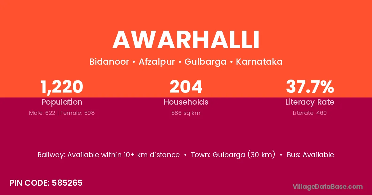 Awarhalli village has a total population of 1,220 people, of which 622 are males and 598 are females.