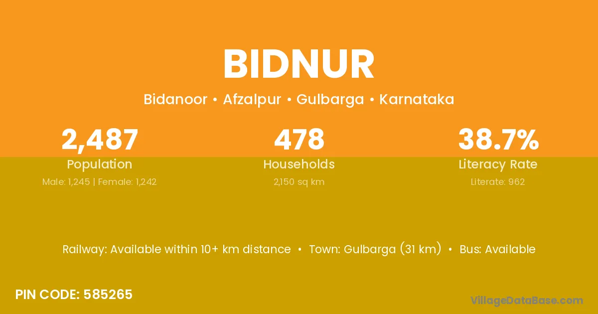 Gulbarga (31 km) is the nearest town to Bidnur village for major economic activities and is located approximately 31 km away.