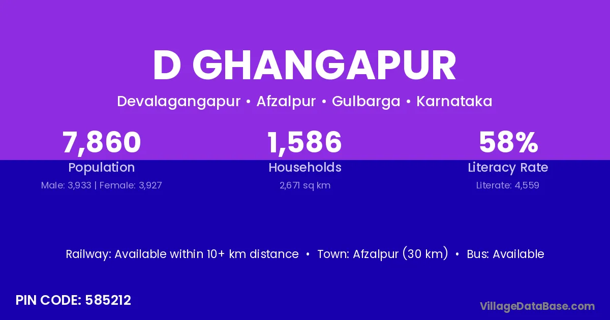Afzalpur (30 km) is the nearest town to D Ghangapur village for major economic activities and is located approximately 30 km away.