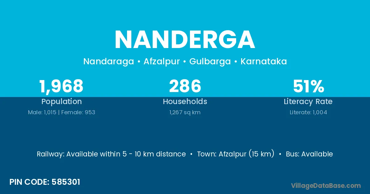 Afzalpur (15 km) is the nearest town to Nanderga village for major economic activities and is located approximately 15 km away.