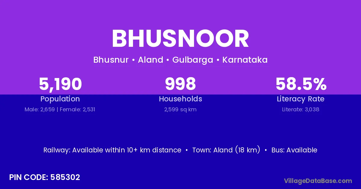 Aland (18 km) is the nearest town to Bhusnoor village for major economic activities and is located approximately 18 km away.
