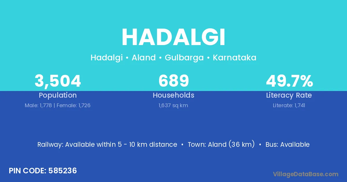 Aland (36 km) is the nearest town to Hadalgi village for major economic activities and is located approximately 36 km away.