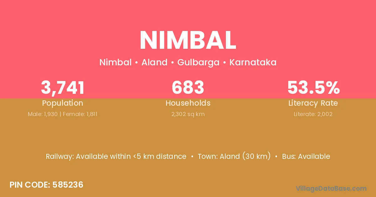 Aland (30 km) is the nearest town to Nimbal village for major economic activities and is located approximately 30 km away.