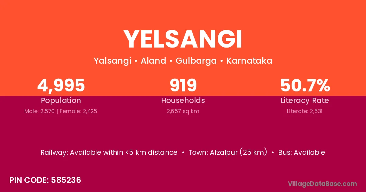 Afzalpur (25 km) is the nearest town to Yelsangi village for major economic activities and is located approximately 25 km away.