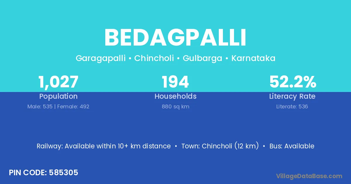 Chincholi (12 km) is the nearest town to Bedagpalli village for major economic activities and is located approximately 12 km away.