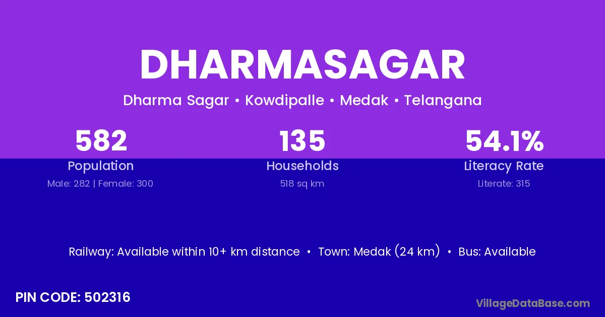 Chincholi (17 km) is the nearest town to Dharmasagar village for major economic activities and is located approximately 17 km away.