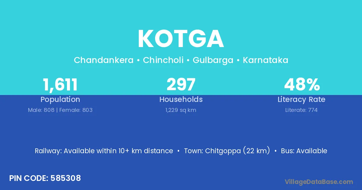 Chitgoppa (22 km) is the nearest town to Kotga village for major economic activities and is located approximately 22 km away.
