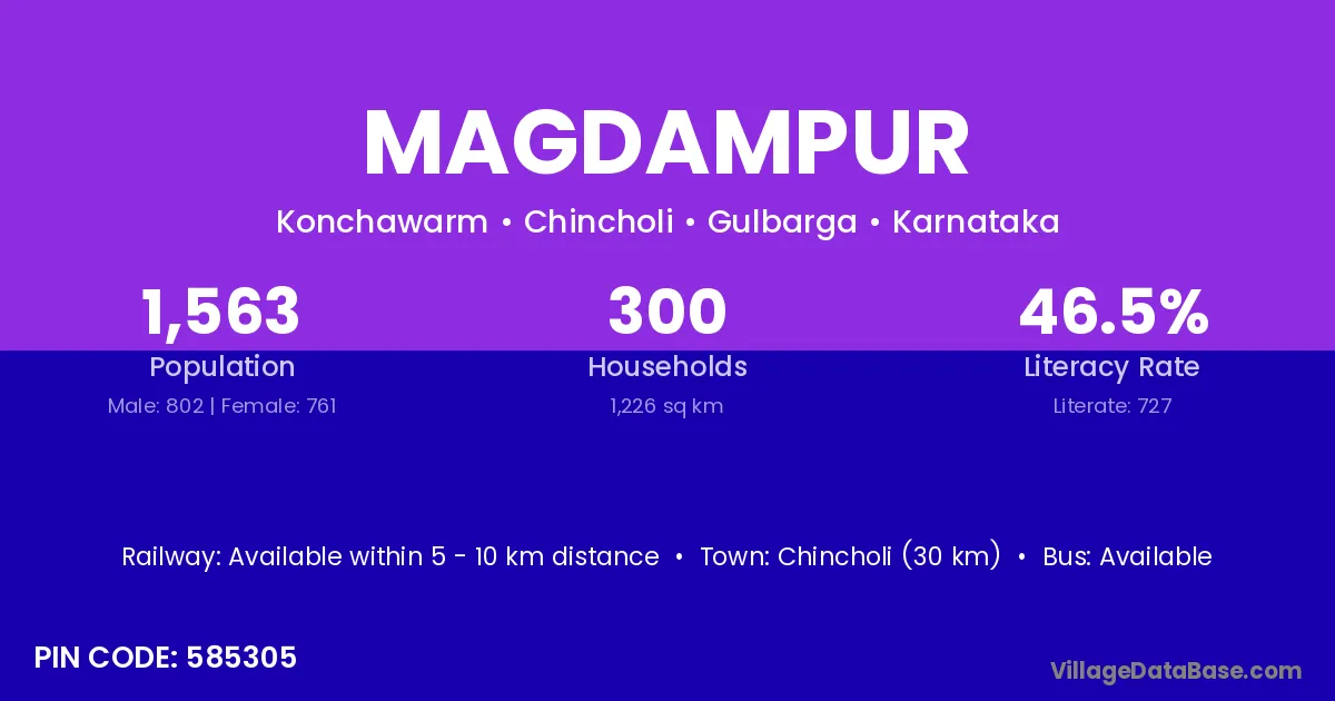 Chincholi (30 km) is the nearest town to Magdampur village for major economic activities and is located approximately 30 km away.