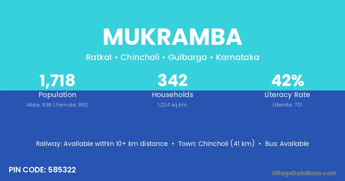 Chincholi (41 km) is the nearest town to Mukramba village for major economic activities and is located approximately 41 km away.
