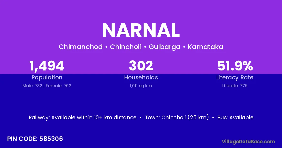 Chincholi (25 km) is the nearest town to Narnal village for major economic activities and is located approximately 25 km away.