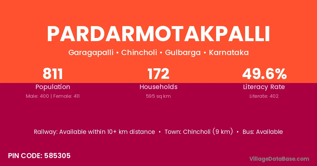 Chincholi (9 km) is the nearest town to Pardarmotakpalli village for major economic activities and is located approximately 9 km away.