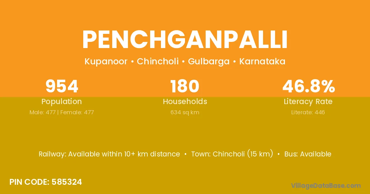 Chincholi (15 km) is the nearest town to Penchganpalli village for major economic activities and is located approximately 15 km away.