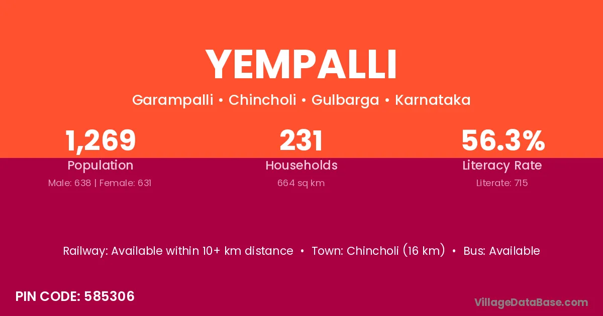 Chincholi (16 km) is the nearest town to Yempalli village for major economic activities and is located approximately 16 km away.