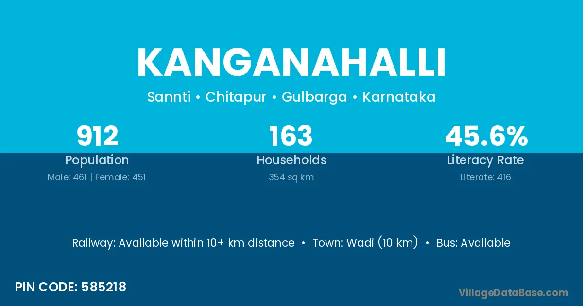 Kanganahalli village has a total population of 912 people, of which 461 are males and 451 are females.