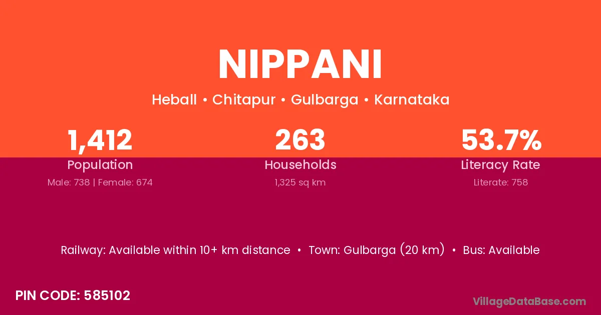 Gulbarga (20 km) is the nearest town to Nippani village for major economic activities and is located approximately 20 km away.