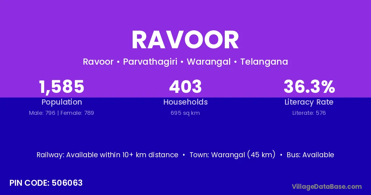 According to Census 2011 information, the village code of Ravoor village is 585225.
